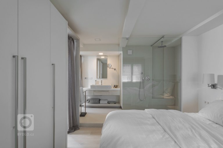 Z bývalé – velmi zdevastované – prádelny pod střechou prvorepublikového domu vznikl malý byt pro časté cesty manželského páru do Prahy. Místo pro setkávání s dospělými dětmi, pro přespání po divadelním představení nebo schůzce: otevřený interiér pro dva, kuchyň s jídelnou, pohodlné sezení, ložnice propojená s koupelnou, volné průhledy bytem i malá terasa kolem něj. Decentní barvy a měkké textilie vytvořily důstojné prostředí pro obraz Vladimíra Komárka.