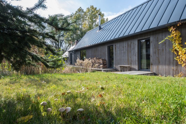 Majitelé roubenky si přáli využívat ji celoročně, ale potřebné zateplení by zničilo původní vzhled. Rozhodli se proto roubenku citlivě zrekonstruovat a využívat přes léto pro soukromí návštěv. Za jejími zády postavili dům nový, který poskytuje veškerý komfort také v zimě. Dům dodržuje místní regulace, respektuje tradiční venkovskou zástavbu a materiály zapadá do okolního prostředí, přesto je už na první pohled současný.