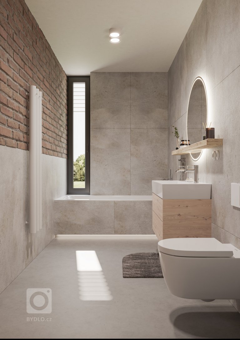 Prirodzená farebnosť a pravdivosť materiálov sa odráža aj vo 2 kúpeľniach. V kombinácii s mikrocementovou podlahou jemnej sivo-pieskovej farebnosti a priznaných repasovaných tehál, môžeme povedať, že sa materiály navzájom príjemne podporujú a vizuálne dopĺňajú. Materiálovú celistvosť interiéru v podobe drevo-tehla-betón dopĺňa gresový obklad cemento-pieskového odtieňa v hygienických priestoroch.