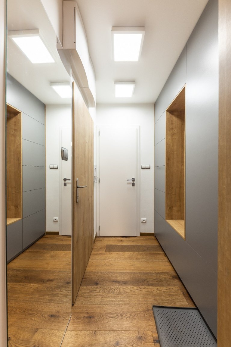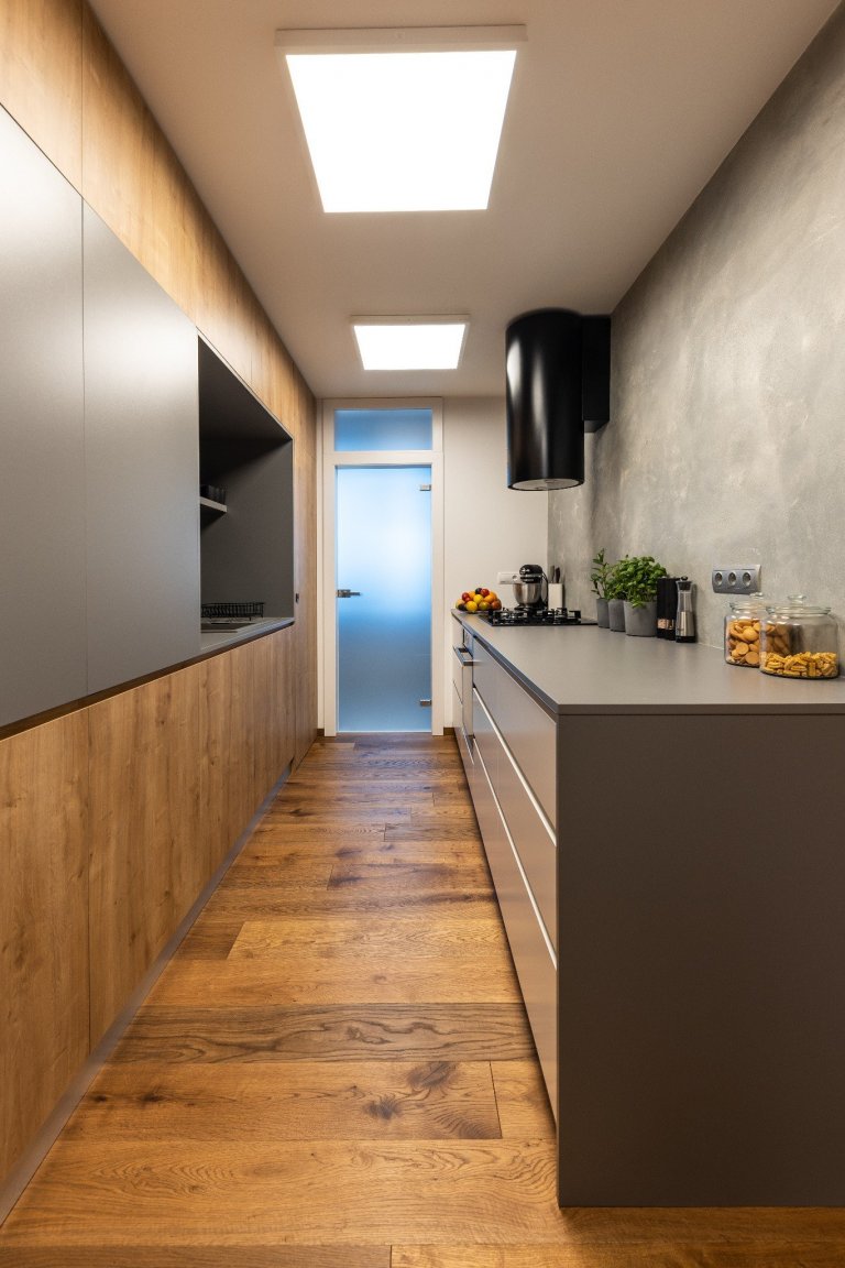 manželský pár s dvoma deťmi už dlhšie uvažovali nad zmenou. dlhodobo bývali v trojizbovom byte, kde všetci oceňovali blízkosť centra mesta. vhodný rodinný dom sa im nepodarílo nájsť a preto sa rozhodli pre ráznu rekonštrukciu svojho súčasného bytu. najzákladnejšou zmenou bola pre majiteľov dispozičná zmena bytu, nakoľko priveľká nevyužiteľná hala a hlavne neusporiadaný denný priestor. malá kuchyňa bola totiž umiestnená na opačnej strane bytunež obývačka. majiteľom sme navrhli tri varianty nového usporiadania, pričom si zvolii možnosť prepojeného denného priestoru v jednej línií s nadväznosťou na balkón. kuchyňa a chodba sa dajú od priestoru obývačky oddeliť masívnymi dverami s geometrickým zárezom. kuchyňu od predsiene oddeľuje vstavaný nábytkový blok, ktorý z jednej strany tvorí kuchynskú linku a z druhej úložný priestor v predsieni. koncept detskej izby nadväzuje na celý interiér, avšak samotný dizajn bol prispôsobený najmladšej dcére, nakoľko starší syn sa už u rodičov často nezdržiava. izba je však prispôsobená obom súrodencom, počíta dokonca aj s návštevami. dlhý stôl a veľký šastník s vyklápacou posteľou poskytujú dostatok priestoru pre všetkých. publikácia v môjdom 02/2022