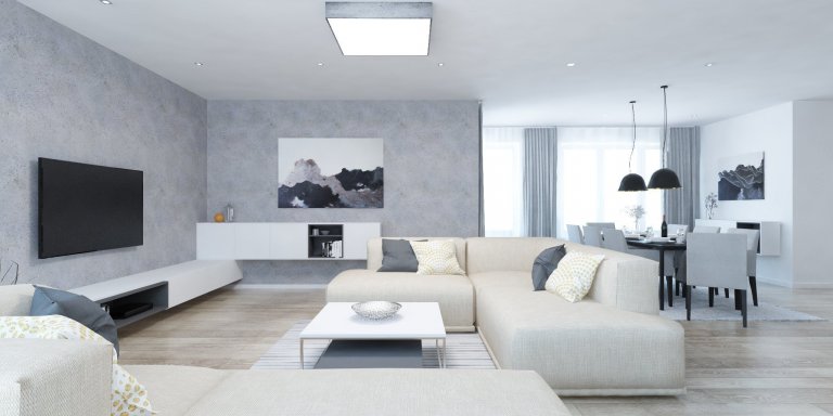 Achromatický interiér v bielych a sivých odtieňoch dômyselne zútulňuje veľkorysá modulová sedačka v hrejivej béžovej farbe, ktorá prepája jednotlivé funkcie interiéru a zároveň komunikuje s exteriérom.