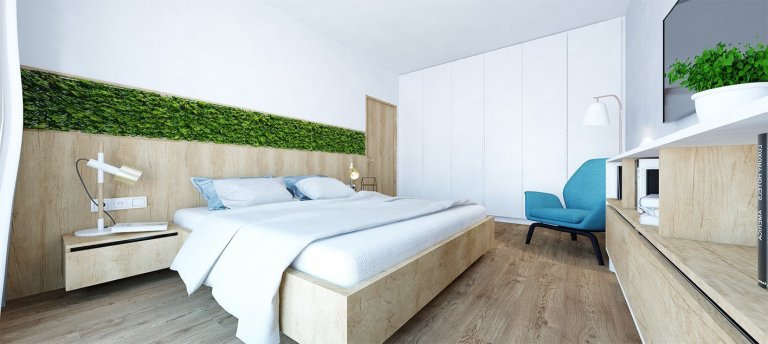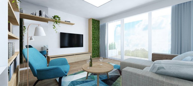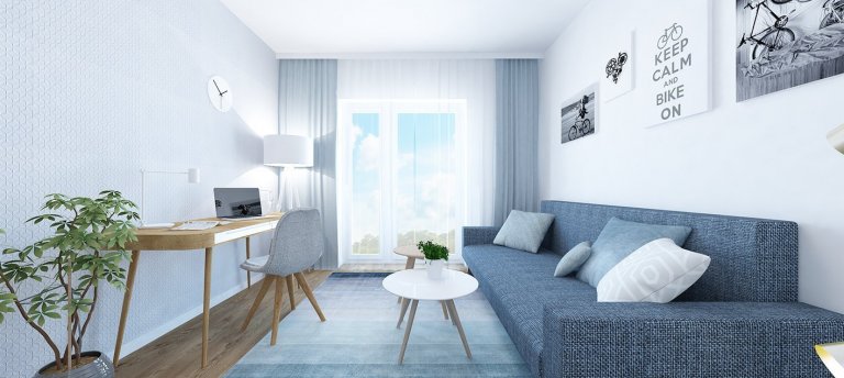 Projekt bytu Pri Mýte je charakteristický doplnkami a akcentami v modrej farbe.