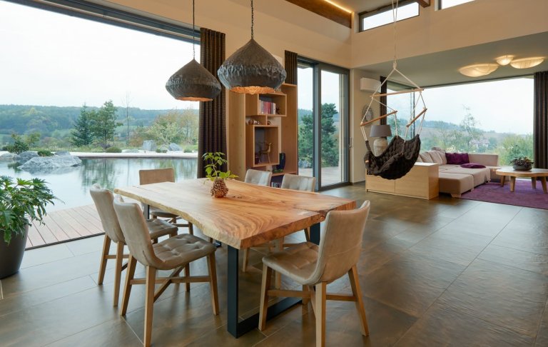 Krásný dům situovaný v nerušené přírodě. V hlavní roli této realizace je zvolený materiál. A to dýha dub rustikální přírodní s jemnou strukturou dřeviny a medovým tónem. Tento materiál se prolíná celým domem. Efektní je mimo bezúchytkové kuchyně ELITE i dlouhá obložená stěna s integrovanými dveřmi. Extra požadavkem v rámci dodávky dveří bylo zhotovení speciálních dveří do výtahu a schodiště. Schodiště je dokonce pro větší efekt podsvětlené. Přímo u domu si majitel vybudoval větší jezírko, které je další chloubou tohoto pozemku.