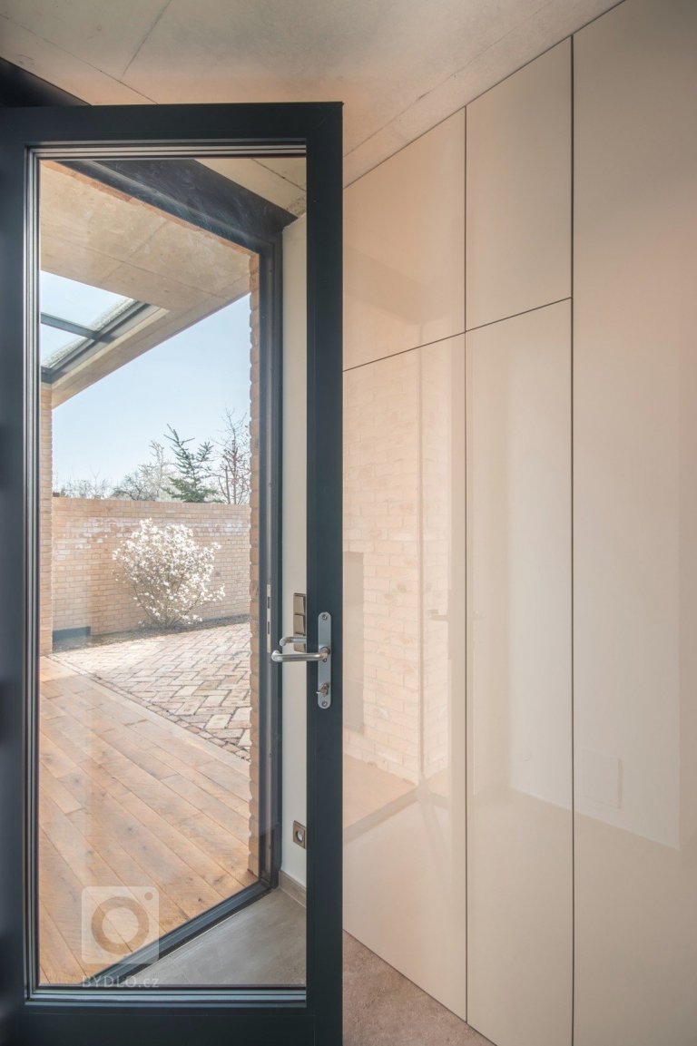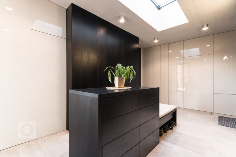 Popis vybavení: Na podlahy domu a schodiště byla položena bělená dubová parketová podlaha, bezfalcové dveře a zárubně s atypickou výškou jsme vyrobili rovněž dubové dýhované a mořené na tmavý odstín. Tento dekor spolu s plochami lakovanými do vysokého lesku dominuje celému interiéru. Technickou specialitou bylo zapracování TV stěny v obývací části do materiálu použitého na podlahu a neviditelné kotvení lankového systému sloužícího jako zábrana proti pádu ze schodiště.