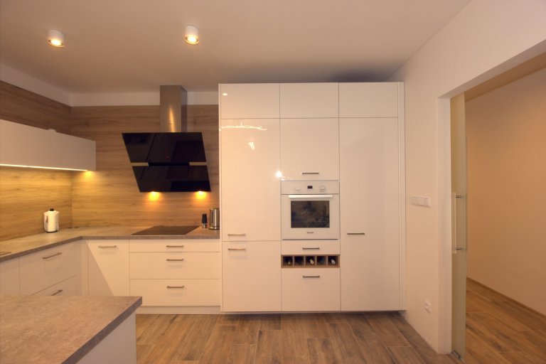 Vize klientky byla jasná, kuchyň s vysokým dřevěným obkladem a vybíhající horní bílá skříňka.