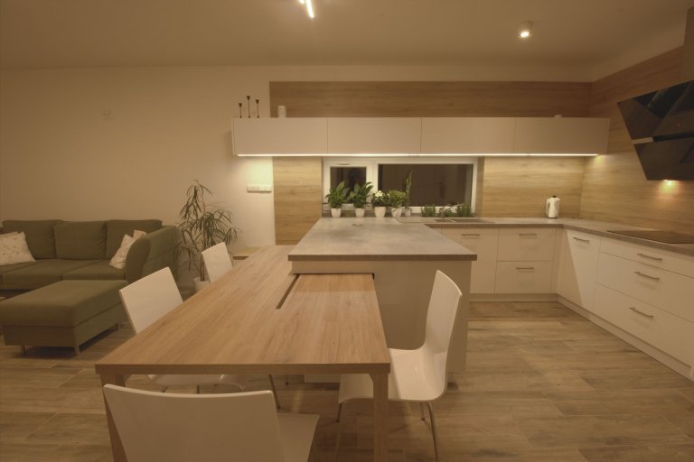 Kuchyně je ve tvaru U a na ní navazující stůl. Stůl je výsuvný a v zasunuté pozici u něj sedí až 4 osoby. Po vysunutí se k němu posadí až 6 osob. Stůl se i otáčí o 90°, což výrazně zvyšuje flexibilitu celého prostoru. Vysoká stěna se spotřebiči je vytažená o nástavce, a s dubovým obkladem tvoří rovinu. Stěna je také předsazena dopředu před kuchyní a celá se tak odlehčila. Pro rozbití plochy, je pod troubou nika pro ukládání vína. Okno za dřezem přímo vybízí k pěstování bylinek. Na ně je za dřezem v desce vana, kterou má paní již bylinkami osázenou.