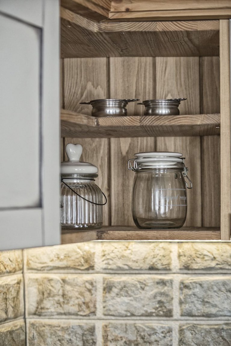 Srdcem zbrusu nového bytu se stala kuchyně, které stejně jako ostatním místnostem vládne romantický styl francouzského venkova. Na odiv dává tolik přitažlivou patinu, která je výsledkem precizní řemeslné práce. Typická nostalgie provensálského stylu je zde patrná na nábytku, zárubních a dveřích vyhotovených ze dřeva získaného ze stoleté stodoly. To bylo patřičně ošetřeno, opracováno a použito na jednotlivé kusy vybavení bytu, aniž by se přitom dřevo vyfrézovalo úplně dohladka. S láskou k patině na něm totiž zůstaly hluboké vrypy a nedostatky způsobené jeho stárnutím. Právě patina tak celému interiéru dodává neobyčejnou hodnotu.