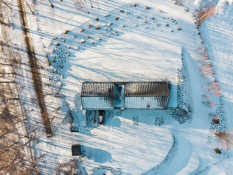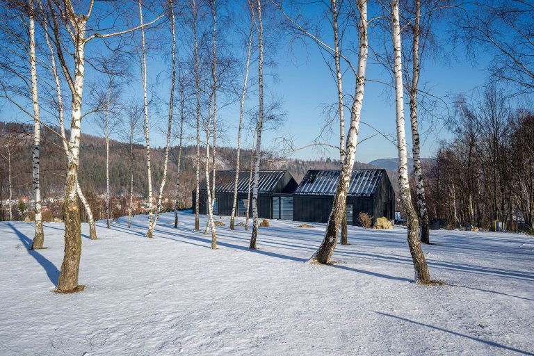V malebné krajině Slezských Beskyd byl do svahu posazen moderní dům, který se stal originálním venkovským sídlem pro pětičlennou rodinu. Z části je zapuštěn do země, a tak od příjezdové cesty ukazuje jen svou horní polovinu s tradiční sedlovou střechou. Z pohodlí domova prohřátého teplem krbu poskytuje úchvatné výhledy do zasněženého okolí.