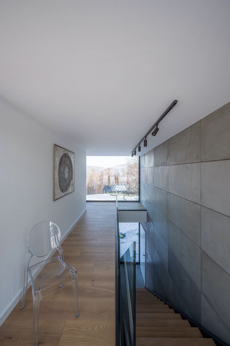 Dvoupodlažní budova rozkládající se na ploše o velikosti 300 m2 se nachází nedaleko města Bielsko-Biała v jižním Polsku. Duo architektů ve složení Gosia Łapaj a Kuba Kowalczyk využilo krásných výhledů na hornatou krajinu i přilehlé údolí a dům zčásti zapustili do svahu. Dům ležící na dlouhém svažitém pozemku navíc do okolí otevřeli velkoformátovými okny, která do interiéru přinášejí dostatek denního světla. Hranice mezi exteriérem a interiérem se tak zčásti setřela. Zajímavým architektonickým osvěžením je i skleněný krček v horní hmotě domu, který odděluje hlavní obytnou zónu od ložnice.