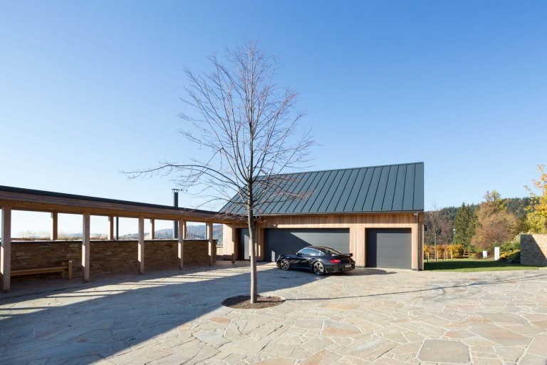 Na první pohled zaujmou jednoduchým a tradičním způsobem řešené hospodářské prostory domu s příjezdovým cestou, kterou vymezují objekty jako technické zázemí či garáže. Navíc tudy vede otevřená krytá chodba, jež lemuje zelení osázenou střechu obytné budovy, která není na první pohled patrná. Obytná část domu se totiž z velké části nachází pod zemí. Tvoří ji dvě vůči sobě mírně zalomená křídla, ve kterých je situována společenská a odpočinková zóna.