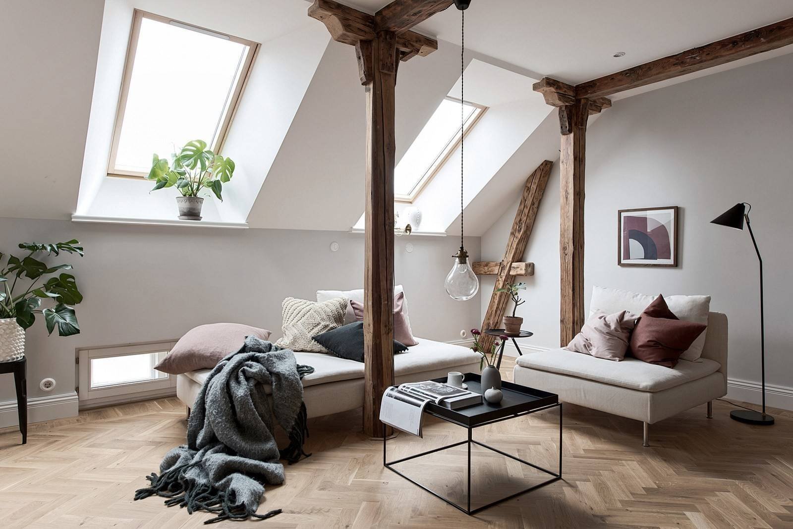 Interiér bytu je typicky skandinávský, a to nejen z hlediska barev, tvarů ale také díky celkovému dojmu. Jsou zde světlé pohovky, tenký, jemný konferenční stolek s geometrickým tvarem a moderní, téměř puristické, osvětlení, tvořené jedinou žárovkou visící nad stolem v obývacím pokoji. Světlým prostorem proudí světlo střešními okny i malými okénky u podlahy. Místnost rozveselují zelené rostliny v květináčích.