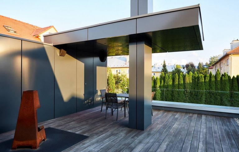 Nová část domu je skryta před zraky kolemjdoucích. Na místo do ulice směřuje do zahrady, takže svým vysoce moderním vzhledem nenarušuje styl původní zrekonstruované stavby. Nachází se zde technický blok z pohledového betonu a také přístavba obytné části bytu na úrovni prvního nadzemního podlaží. Její ozdobou je především střešní částečně krytá terasa s krbem a místem pro odpočinek i malou zahrádkou. Chytré řešení zde zastupuje bondová větraná fasáda a hliníková okna, tedy kvalitní prvky nenáročné na údržbu. Nově přistavěná obytná část je přitom realizována z keramických bloků, zatímco technická část z monolitického betonu s vnitřním zateplením. K objektu se navíc podařilo zakomponovat dva samostatné vstupy na pozemek a vlastní vstupy pro každou bytovou jednotku. Dům získal i moderní oplocení, prakticky a pěkně na pohled působí také zpevněné plochy z žulových odseků v rastru z řezaných žulových bloků.