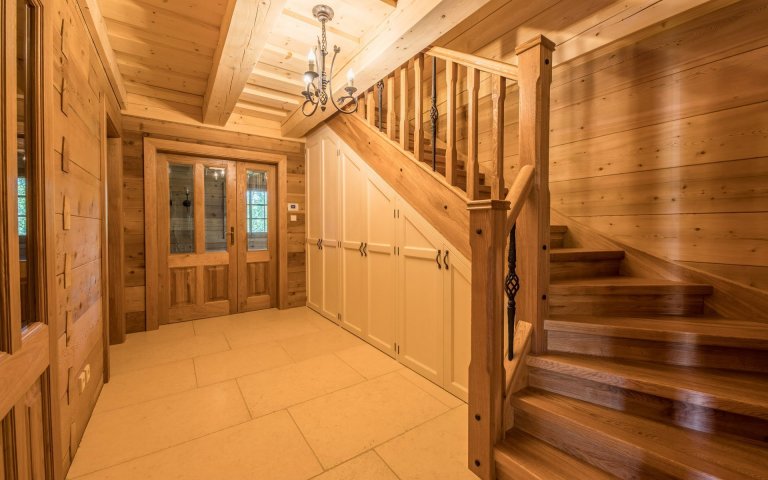 V roubence se místnost po místnosti příjemně střídají tradiční i luxusní prvky, díky čemuž vzniká tak přitažlivá kombinace rustikálního a elegantního stylu. Najdeme zde lustry s nádechem starých časů, volně stojící vanu jakoby ze zámku, luxusní stolek s umyvadlem, staronovou kuchyňskou linku, malované nádobí, ozdobné garnyže s typicky venkovskými závěsy či zajímavě řešená zábradlí – a to vše příhodně korespondující s tak příjemnou texturou všudypřítomného cedrového dřeva.