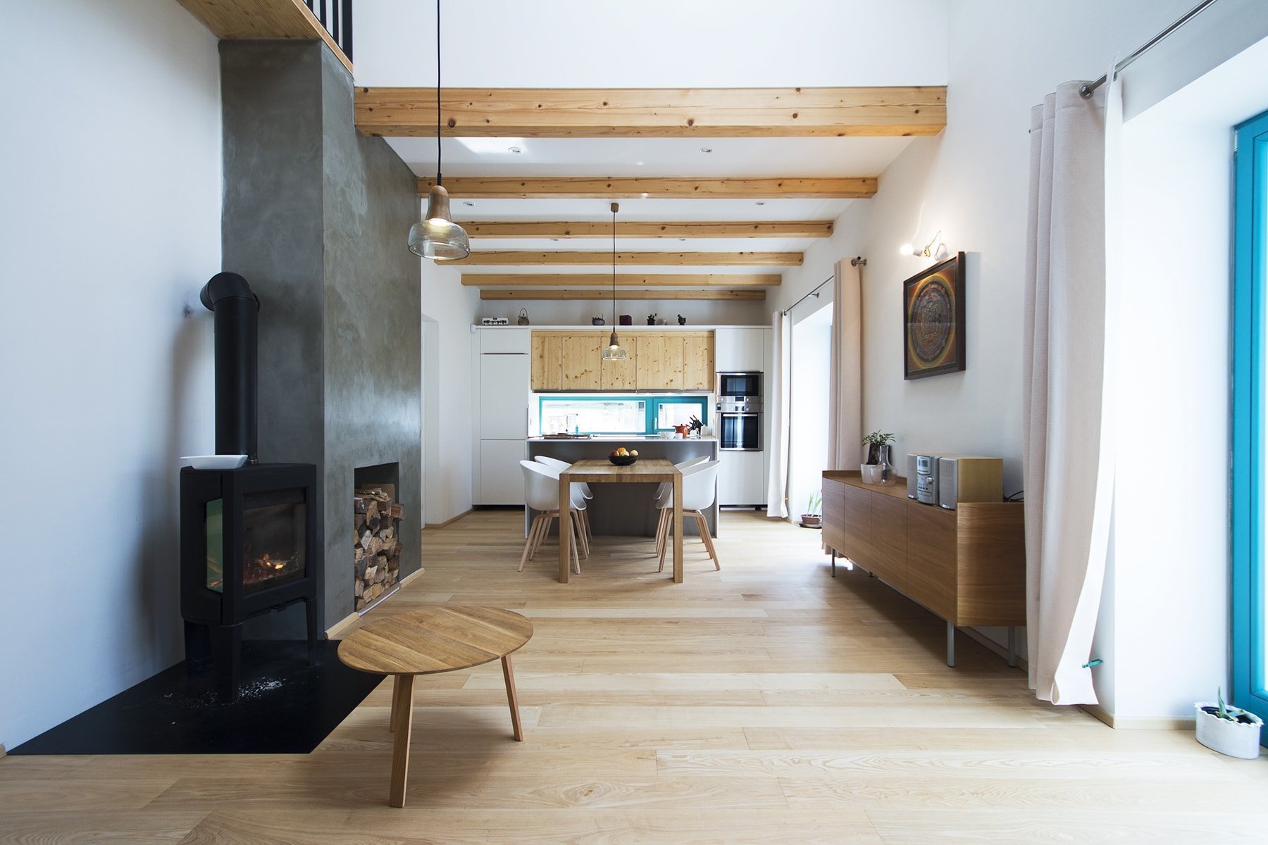 Po nekompromisním probourání stropu a příček se centrem domu stal převýšený obytný prostor s kuchyní, jídelnou a okouzlující dřevěnou vestavbou dosahující výšky až šesti metrů. Dřeva je tu vůbec používáno hojně a spolu s dalšími přírodními materiály tak toto nové bydlení vzdává hold poctivé řemeslné práci a přírodě. A tak se není čemu divit, že tu najdete dubový nábytek, jasanové podlahy a smrkové obložení stěn. Vše je ponecháno v přírodním duchu, jen dřevěná okna a vstupní dveře krášlí nátěr v příjemné modré barvě.