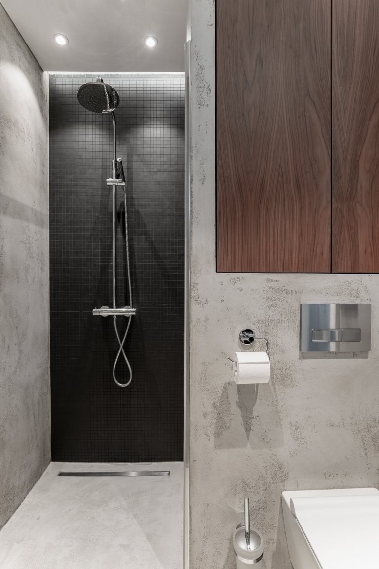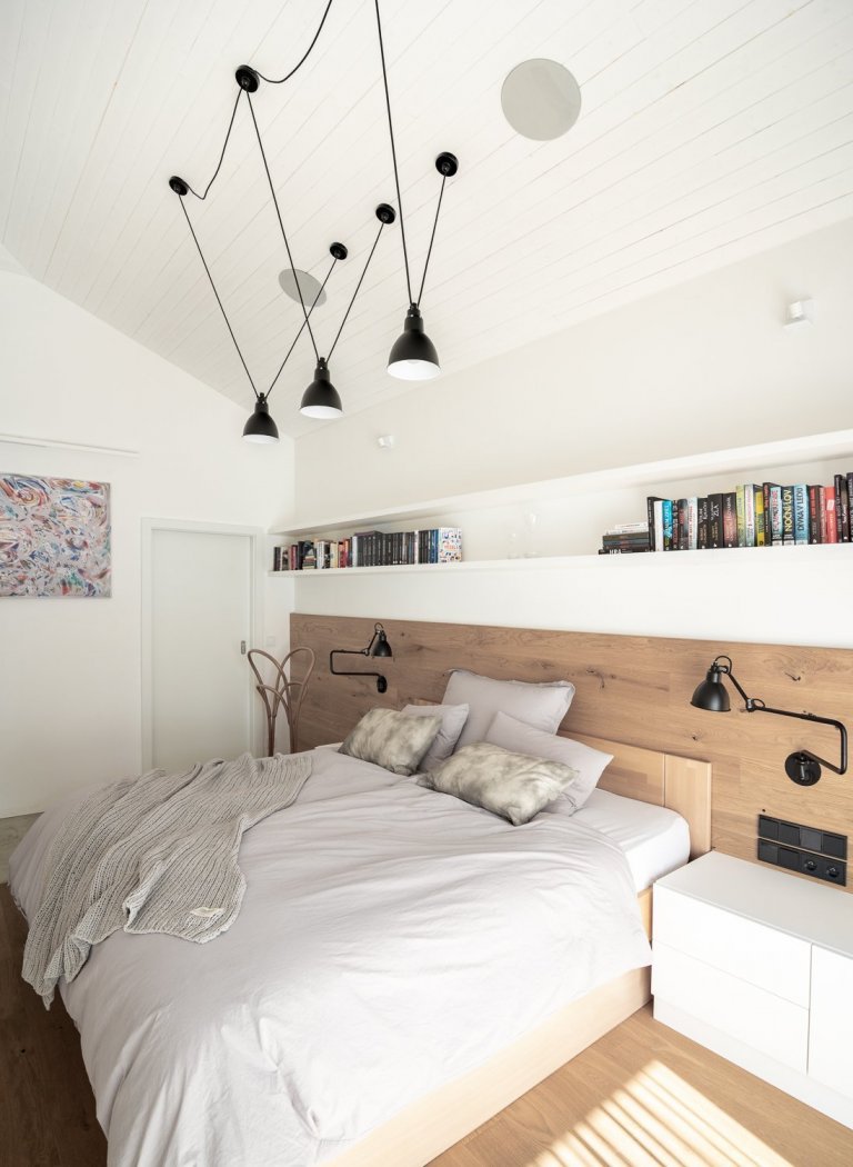 Ložnice & koupelny – obě místnosti byly původní, pouze jsme je doladili pomocí doplňků a drobných úprav. Ačkoliv je ložnice malá, nepůsobí stísněným dojmem. Přičinil se k tomu vysoký strop a světlé barvy. Dřevěné obložení stropu vytvořilo geometrický prvek linií, které pocitově rozbily plochu stropu na menší části. Ten se tak stal zajímavým fragmentem místnosti. Dřevěná podlaha přechází v obložení stěny, která tak podtrhuje samotnou postel vůči protilehlé nábytkové stěně. Aby bílý nábytek nesplýval se stěnou byl podtržen šedou betonovou stěrkou. Pokud hovoříme o čistých liniích, tak nemůžeme opomenout ani dlouhou polici na knihy, čtecí lampičky a výrazné černé osvětlení nad postelí. Pro pocit zútulnění jsme použili lehké voály a lněné povlečení na postel. Umělecké předměty klienta už jen podtrhují celkovou atmosféru místnosti.
