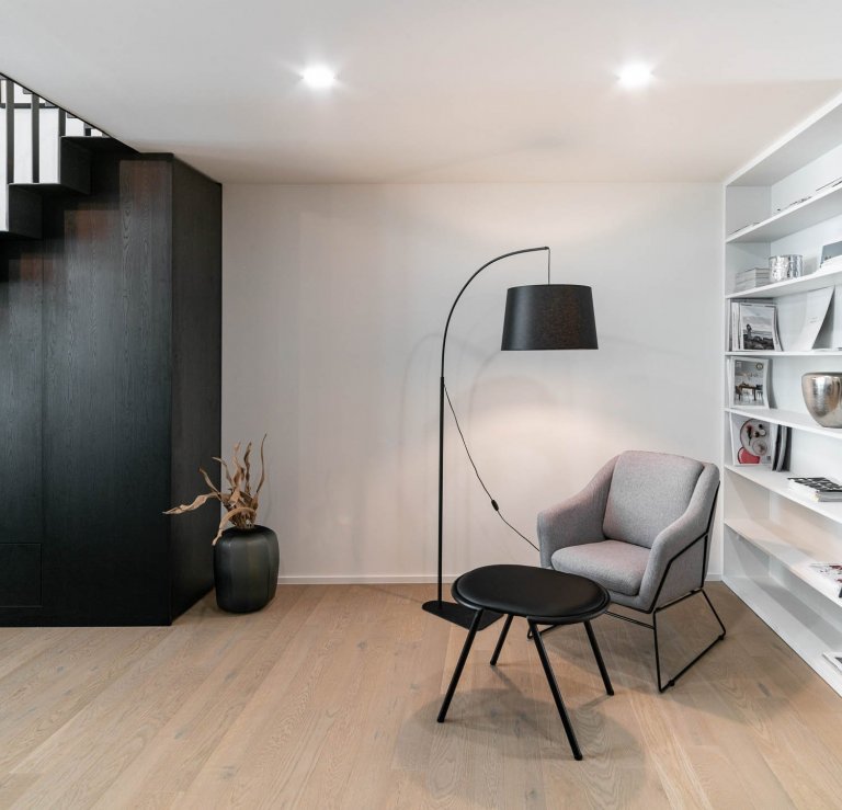 Koncept/ barevnost / materiály – Díky vysokým stropům a podlouhlému tvaru bytu jsme zachovali světlý koncept. Bílá barva na zdech a světlá podlaha v dekoru běleného dubu, odráží denní světlo. Nábytek a vybavení je převážně v bílé a šedé barvě. Do kontrastu se dostáváme v případě kuchyně a úložného prostoru pod schody, kde jsme naopak zvolili materiál tmavý. Ocelové subtilní prvky v podobě schodiště a zábradlí dodávají interiéru linie, které prostor opticky oddělují.