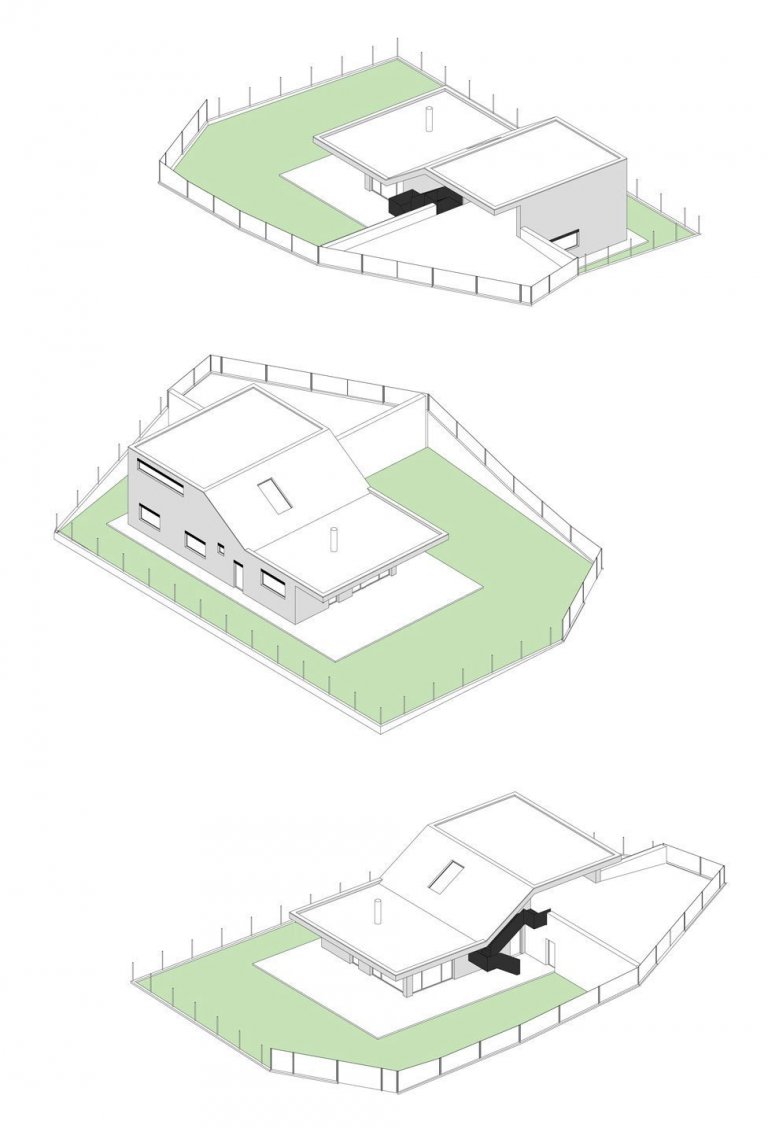 Hlavní vstup do domu se nachází pod venkovním schodištěm. Za ním vedoucí chodba prostupuje prostředkem domu a ústí do velkoryse navrženého obývacího pokoje s kuchyní. Stěny pokoje orientované jižním směrem, tvoří velké posuvné výkladce, které pokoj dokonale propojují s terasou a následně i zahradou a pouští dovnitř dostatek denního světla.