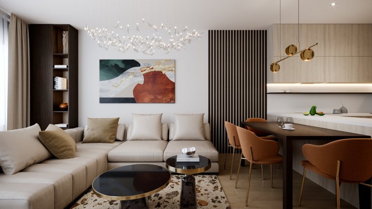 Predstavujeme vám luxusný interiérový design bytu ve Sky parku z interiérového štúdia PRUNUS. Terakotová farba v harmonickom interiéri navodí dobrú náladu a upozorní na seba. Tmavý dub na nábytkoch vytvára príjemné materiálové napätie k javorovej kuchyni.