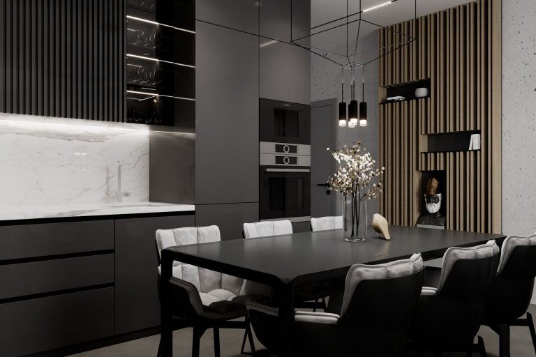 Zariadenie interiéru vytvára dokonalú súhru krásnych kameňov Mramoru Nero Marquiny a Calacatty Gold. Kamene spolu s čiernou, šedou, bielou farbou a dubom dotvárajú esenciu materiálov.