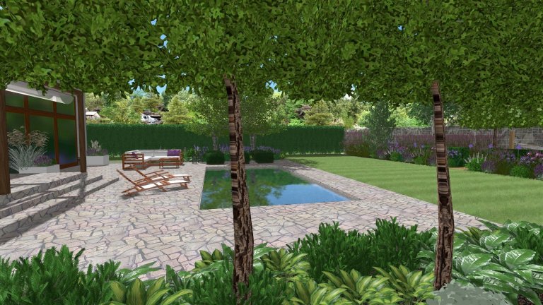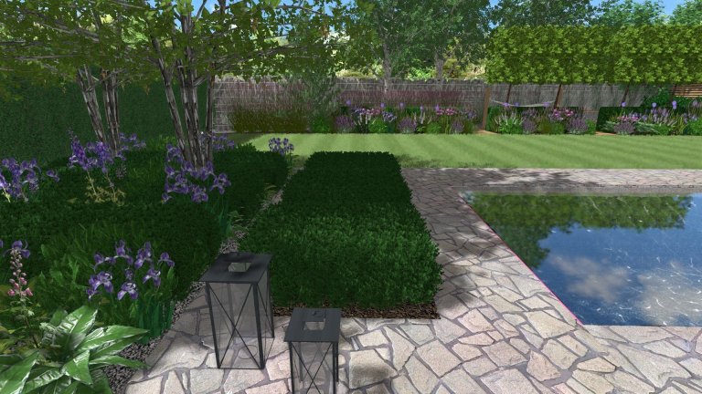 Po druhé straně basénu navrženo velký záhon vyplněný bylinami kvetoucími fialově. Zajímavým akcentem budou střižené živé ploty z tisů, jež budou pokračovat na terase, tvoříc geometrický tvar na ploše terasy. Nad celým záhonem bude dominovat výsadba mnohakořenových, velkých keřů , jejichž koruny budou vyvedeny vzhůru, čímž vytvoří dojem zakrslých stromů s mnoha kmeny. tento záhon bude oddělovat část rekreační od části zahrady na severní straně. Na terase, kromě rostlin navrženo rovněž místo pro komplet dřevěného zahradního nábytku, jak rovněž ozdobných prvků, jako například lucerničky.