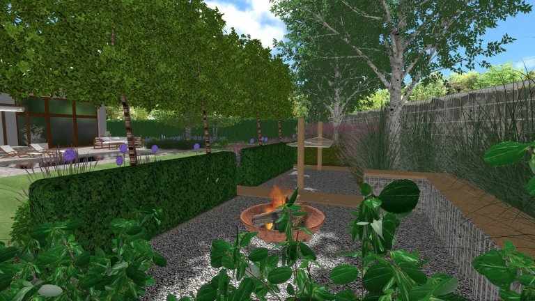 Rekreační část byla rozdělena na několik menších zahradních prostor. Nachází se v blízkosti zídky a od trávníku je dělí záhony rostlin, jejichž pozadí tvoří živý plot z tisů. Dodatkovou oddělující stěnou jsou stromy zastřižené ve tvaru šestihranu (stejně jako u basénu). Nachází se zde ohniště obklopené lavičkama z gabionů, místo pro zahradní houpací síť a ovocné keře. Celý prosotor bude obklopen skupinami vysokých trav. V předurčených místech se rovněž objeví himalájské břízy. Povrch bude upraven ozdobnou drtí a místy budou dřevěné stezky. Na záhonech navrženo kompozici z kvetoucích bylin. Barevný podklad stanoví fialová, růžová, modrá a bílá jak rovněž různé odstíny zeleně. Zadní stranu zahrady bude tvořit vysoký gabionový plot.