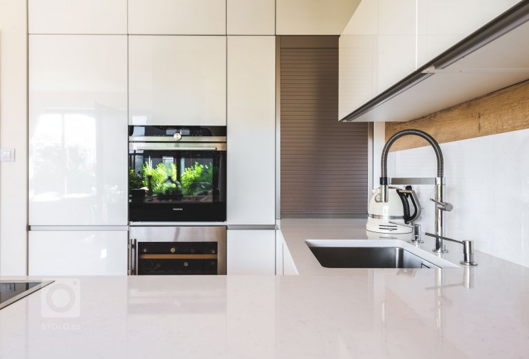 V kuchyni Top White Gloss se od první chvíle budete cítit jako doma. Vše je tu vyladěno přesně tak, jak to máte rádi. Vysoká potravinová skřín s výsuvem širokým 30 centimetrů vám umožní maximálně pohodlný přístup k surovinám. Otočíte se a před sebou máte velkorysou pracovní desku s obkladem Technistone. Otočíte se ještě jednou a rovnou můžete podávat na rozměrný jídelní stůl pro čtyři. Masivní stůl elegantně propojuje dřevěnou podlahu a prvky ve světlém dekoru Dub Straight, které prostupují celou linkou. Ta je z lesklé bílé fólie, se zafrézovaným horním LED osvětlením, nerezovou roletkou a nerezovými úchytkami. Krásně prosvětluje prostor a s ním i atmosféru. Jestliže toužíte po harmonickém, praktickém a zároveň uchvacujícím řešení, tahle kuchyně rozhodně patři k vám do rodiny.