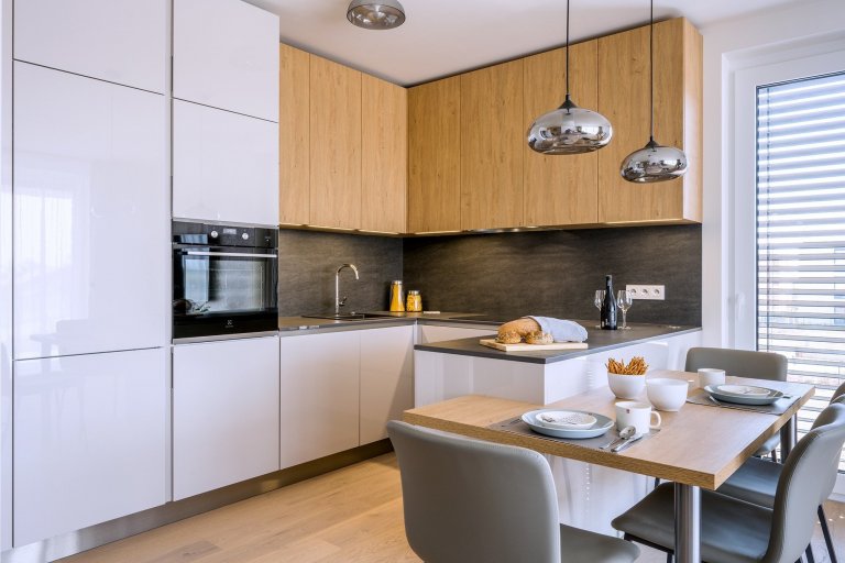 Do tohoto bytu jsme vytvořili nábytek na míru. Celý byt je laděný do přírodních barev, které jsou nadčasové. Odstín Kashmir krásně doplňuje dřevo v přírodních barvách. Kuchyně je v laku s vysokým leskem a úchytkou exclusive. Na zbývající nábytek v interiéru je ve stejném odstínu zvolený matný lak s použitím nanotechnologie se zafrézovanými úchytkami z dubu přírodního.