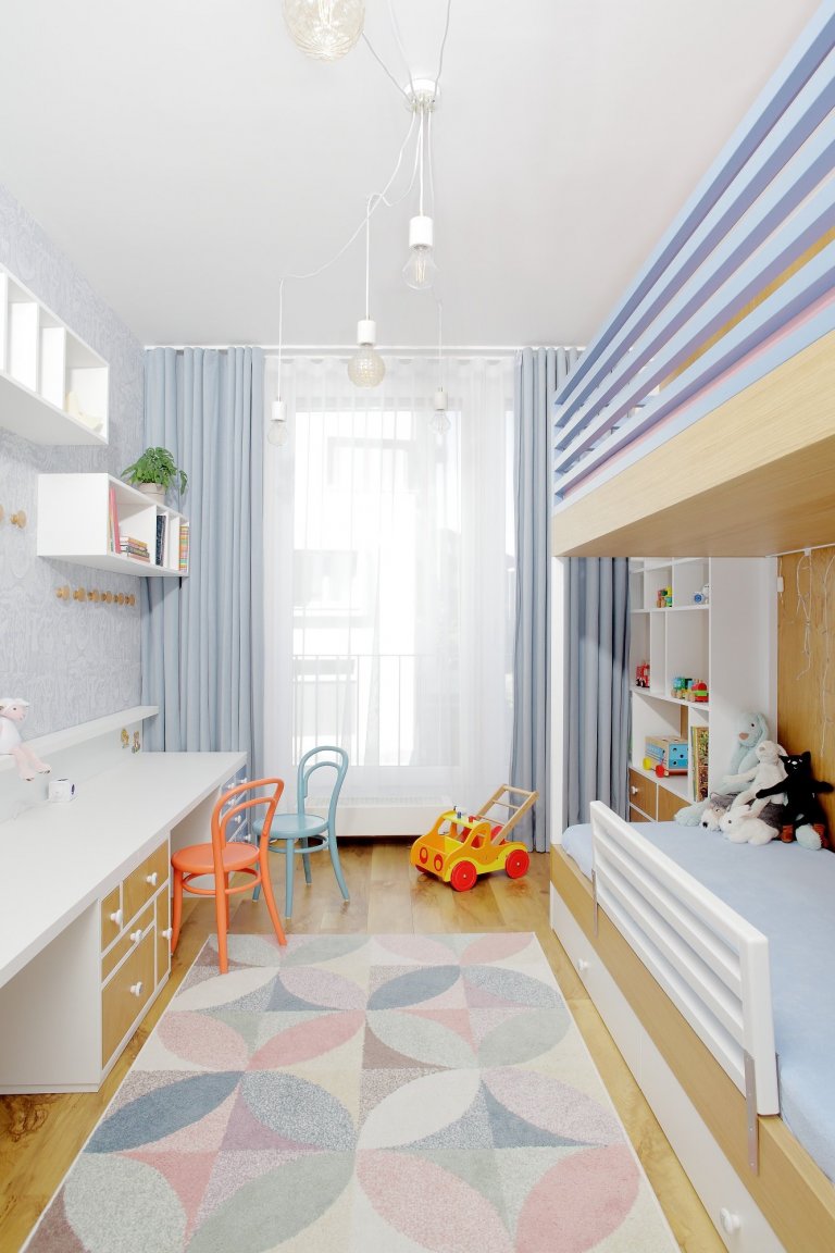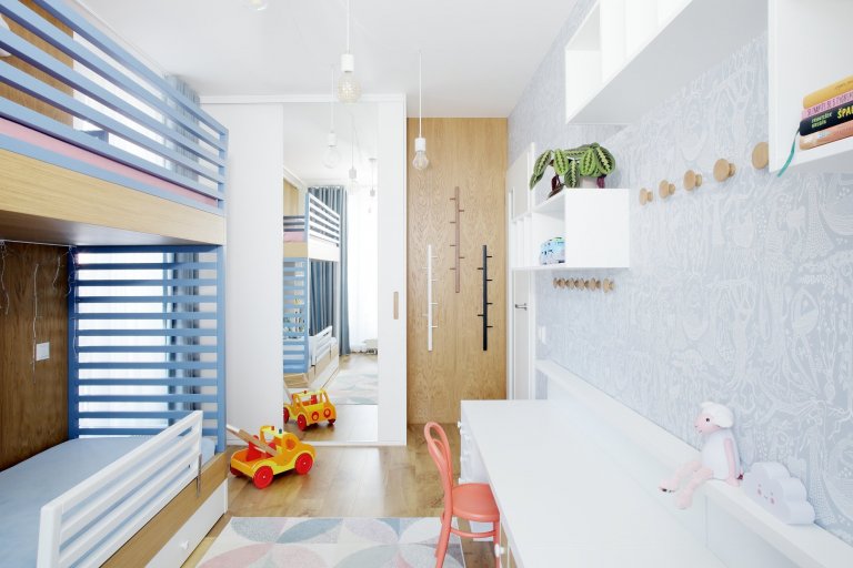 Představujeme vám parádní dětský pokoj se zábavnou sadou asymetrických šuplíků! V této úzké místnosti jedné straně vládne poschoďová postel s pastelovými žebřinami a druhé prostorná pracovní plocha podložená zásuvkami s kulatými úchyty. Bílá a modrá barva lamina se zde střídá s přírodní texturou dubového dřeva, což dodává prostoru lehkou a útulnou atmosféru. Najdete tu také řadu věšáků, ať už nad stolem nebo v koutku u šatní skříně. To proto, že omezený prostor lze mnohem lépe využít, když se vám hračky a oblečení nepletou pod nohama.