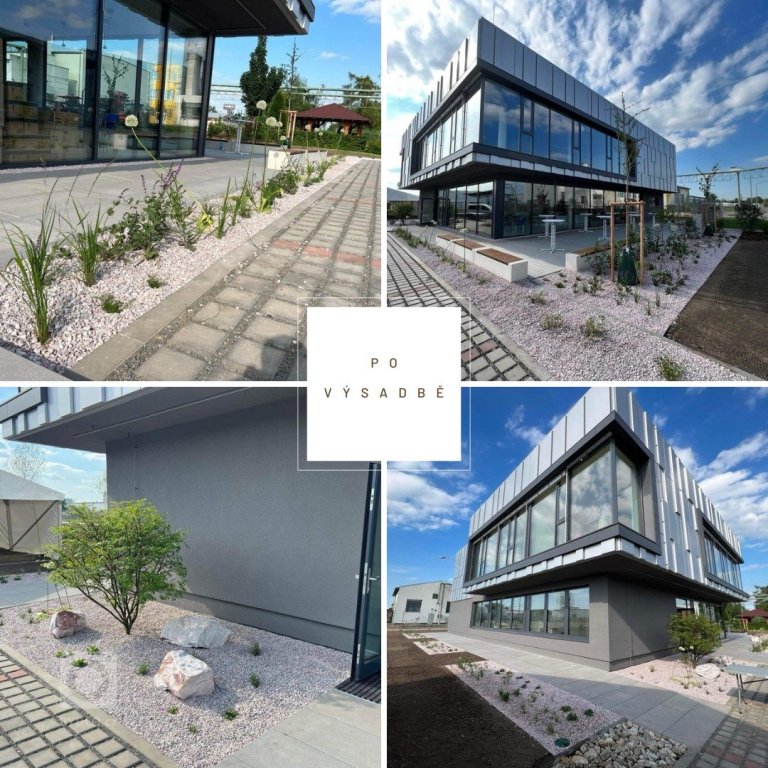Firemní areál podruhé aneb jak to vypadá po realizaci. Na první fotce je situace ihned po výsadbě. Druhá fotka ukazuje již zmíněnou sílu trvalek po jednom jediném roce. Vypadlo zde sice několik kusů, ale drobná dosadba a hlavně pravidelná údržba vše spraví. Nebojte se používat trvalky! Odmění…